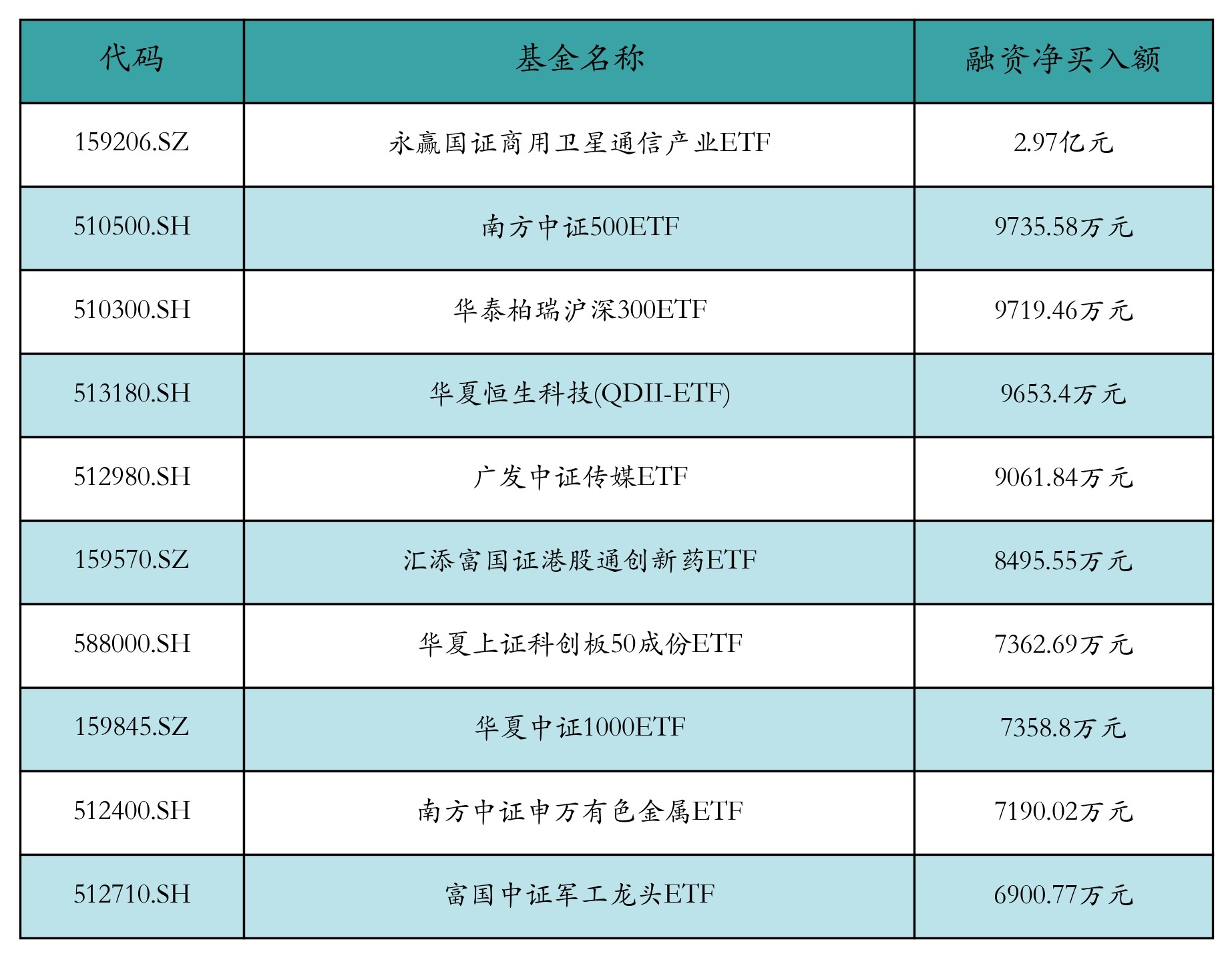 1月9日ETF融资净买入额前三位分别为:永赢国证商用卫星通信产业ETF(2.97亿元)、南方中证500ETF(9735.58万元)和华泰柏瑞沪深300ETF(9719.46万元),前10具体见下表: