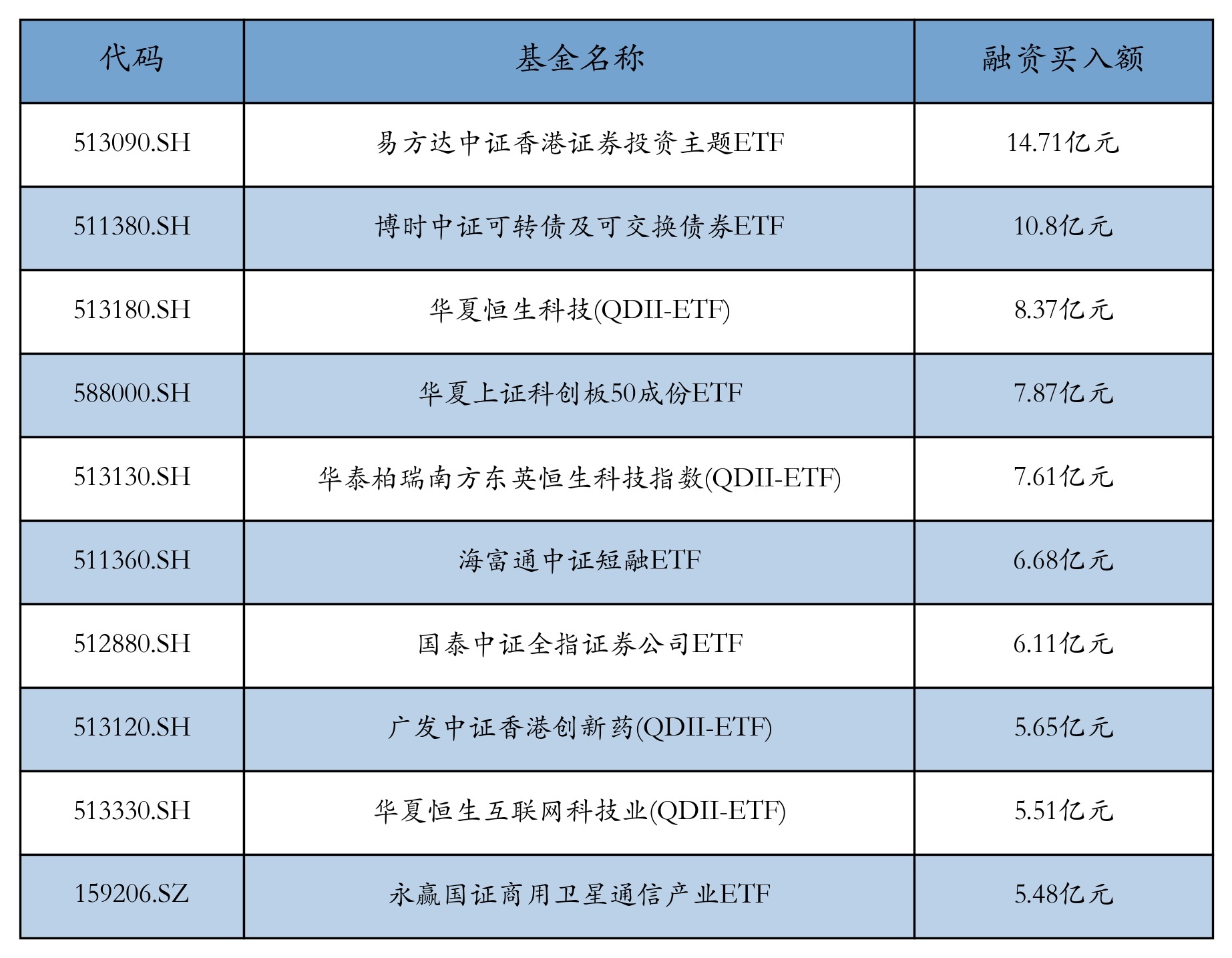 1月9日ETF融资买入额前三位分别为:易方达中证香港证券投资主题ETF(14.71亿元)、博时中证可转债及可交换债券ETF(10.8亿元)和华夏恒生科技(QDII-ETF)(8.37亿元),前10具体见下表: