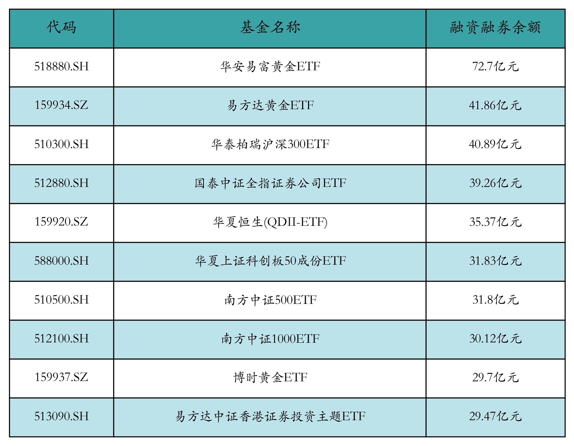 1月9日ETF两融余额前三位分别为:华安易富黄金ETF(72.7亿元)、易方达黄金ETF(41.86亿元)和华泰柏瑞沪深300ETF(40.89亿元),前10具体见下表: